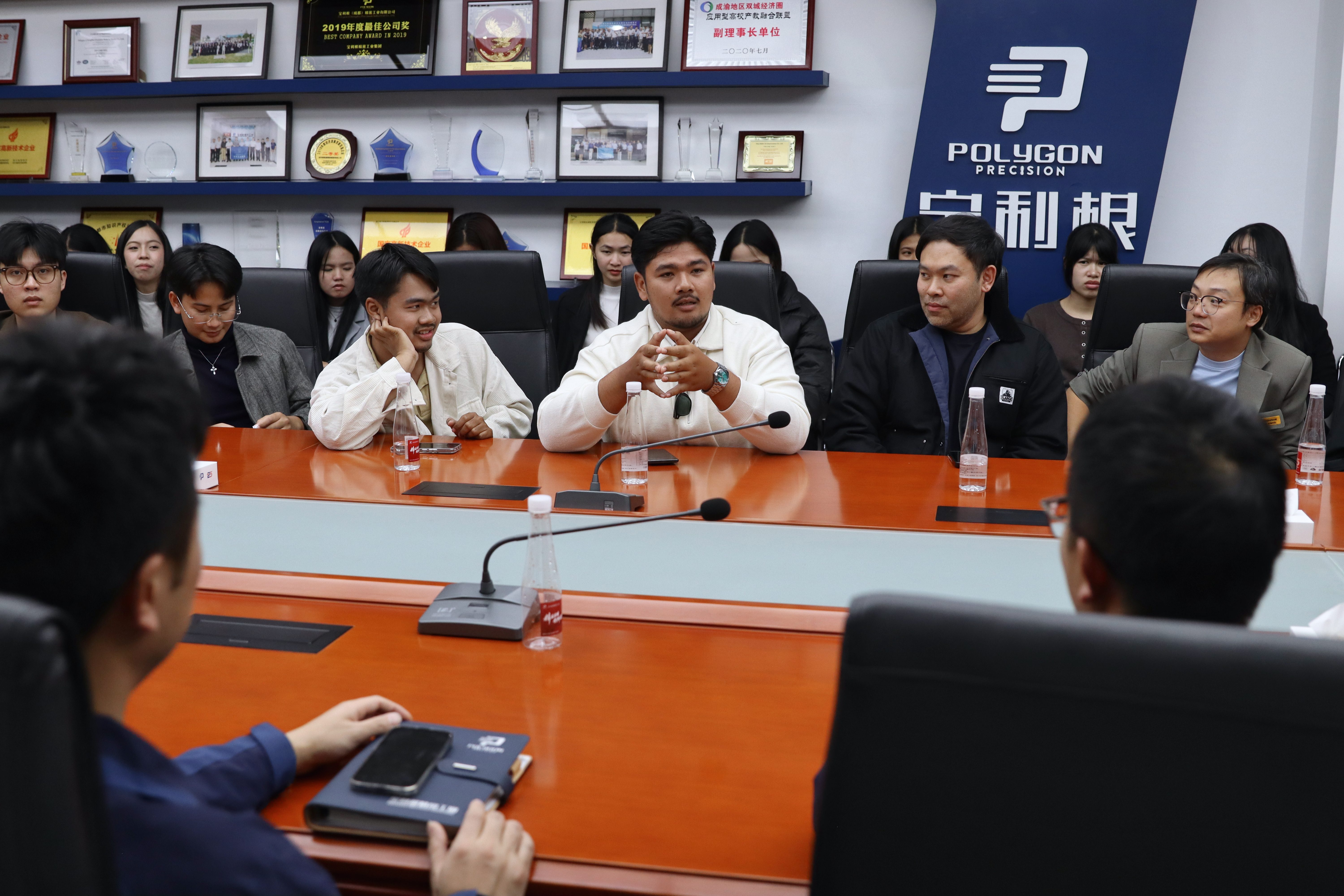 首先,郭总致辞欢迎,并对参会人员进行了介绍。郭总表示,作为一家深耕精密工业零组件制造领域的集团公司,我们始终相信,技术的进步离不开开放与交流。近年来,为应对“中国+1”,响应共建“一带一路”品牌出海,从单一市场突破到全球布局深耕,从中国制造到世界制造,从产品“出海”到能力“出海”,我们在泰国春武里府设立了新的子公司,迈出了国际化布局的重要的一步。我们深知,企业“走出去”不仅是产能的延伸,更是文化的交融与情感的联结。因此,此次交流活动不仅是校企之间的技术交流,更是一次中泰文化的深度碰撞。